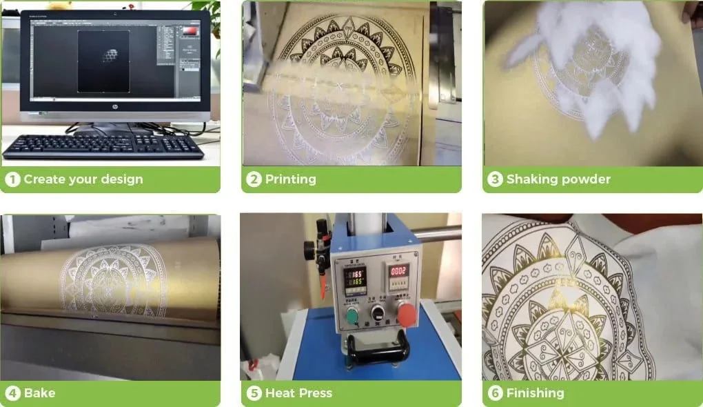 Has the luster and texture of metallic,only need to print the white ink and black ink of the same DTF ink types.